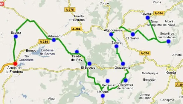 La ruta de los pueblos blancos de Cádiz se adentra en el Parque Natural de Grazalema, y esta compuesta por los siguientes municipios: Alcalá del Valle, Algar, Algodonales, Arcos de la Frontera, Benaocaz, Bornos, El Bosque, El Gastor, Espera, Grazalema, Olvera, Prado del Rey, Puerto Serrano, Setenil de las Bodegas, Torre Alháquime, Ubrique, Villaluenga del Rosario, Villamartín y Zahara de la Sierra.